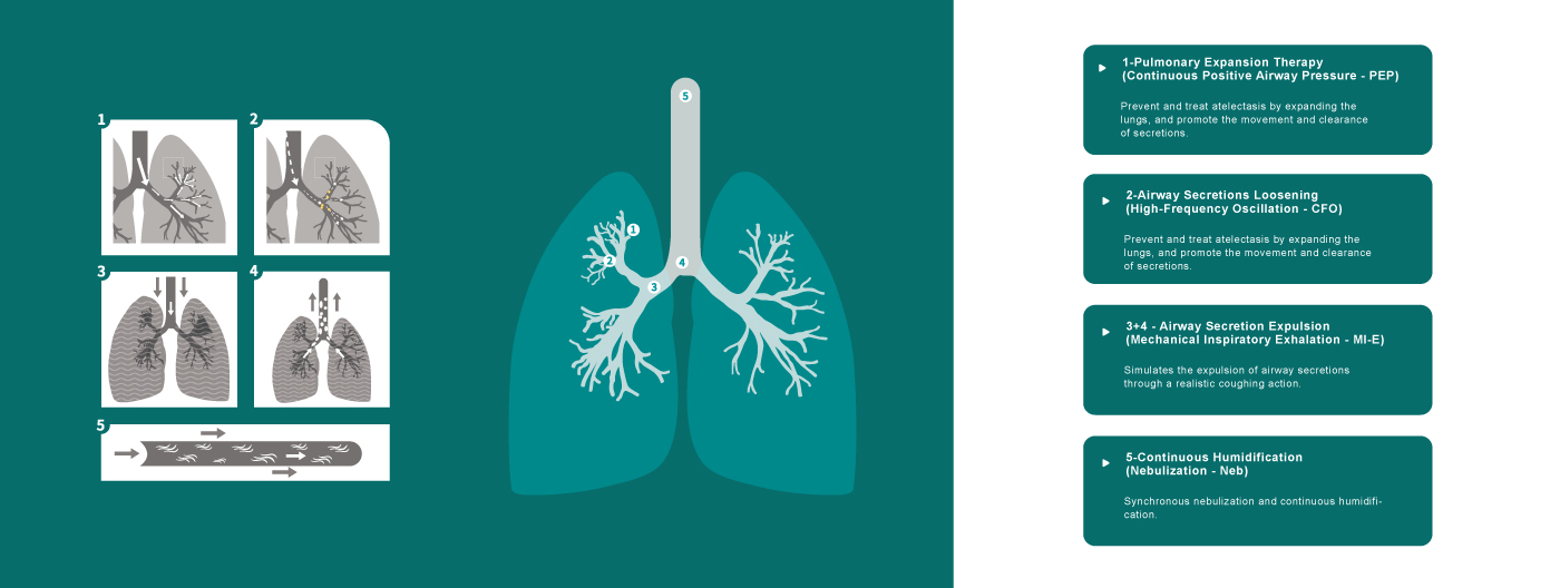 Los sistemas de limpieza de la serie AC están diseñados para fluidificar las secreciones (mediante la oscilación de la vía aérea y la expansión pulmonar - OLE) y simular la tos natural para eliminarlas (MI-E). Estos sistemas brindan a pacientes y profesionales de la salud una solución de limpieza de vías respiratorias eficiente, profesional y confiable.